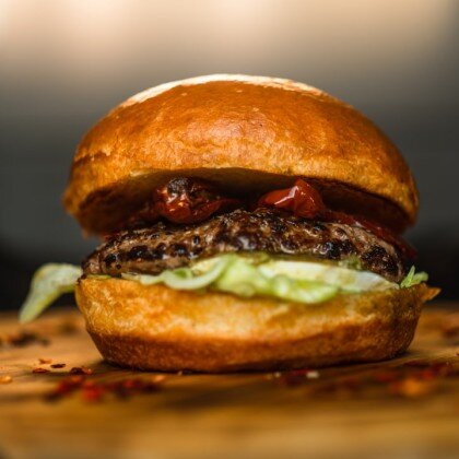 Булочка бриошь, 2 котлеты из мраморной говядины, фирменный соус РИК, сыр Чеддер, салат айсберг, бекон, луковые кольца, томаты, маринованные огурцы